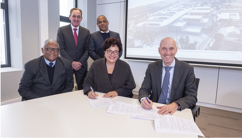Riba e potrèt por mira Minister di Salubridat i Medio Ambiente Sra. Suzy Camelia-Römer akompañá pa dos miembro di MRT, Sr. Stanley Betrian i Sr. Jacques Heide huntu ku Sr. Ernst Kuipers di Erasmus Medisch Centrum na momentu ku a firma e akuerdo importante aki.